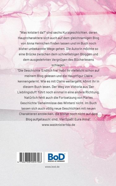 "Was knistert da? Eine Frau packt aus." ist eine Sammlung von Kurzgeschichten, deren Hauptcharaktere sich zum Teil auf dem gleichnamigen Blog von Anna Heinichen finden lassen und im Buch noch bisher unbekannte Wege gehen. Die Autorin möchte so eine Brücke zwischen dem schnelllebigen Bloggen und dem ausgedehnten Vergnügen des Bücherlesens schlagen und die Vorteile von Blog und Buch vereinen.