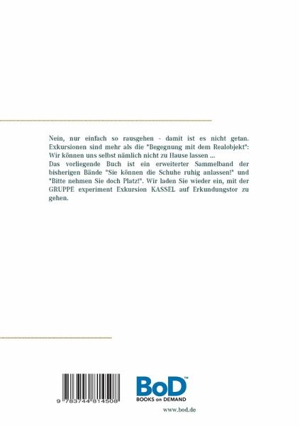 Nein, nur einfach so rausgehen - damit ist es nicht getan. Exkursionen sind mehr als die "Begegnung mit dem Realobjekt": Wir können uns selbst nämlich nicht zu Hause lassen ... Das vorliegende Buch ist ein erweiterter Sammelband der bisherigen Bände "Sie können die Schuhe ruhig anlassen!" und "Bitte nehmen Sie doch Platz!". Wir laden Sie wieder ein, mit der GRUPPE experiment Exkursion KASSEL auf Erkundungstor zu gehen.