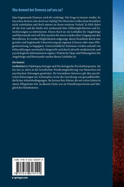 Eine beginnende Demenz wird oft verdrängt. Die Frage ist immer wieder: Ist das schon dement oder doch nur tüdelig? Die Menschen wollen diese Krankheit nicht wahrhaben und doch nimmt sie ihren weiteren Verlauf. Es fehlt dabei oft die Zeit und die Muße sich umfassend über Hilfsmöglichkeiten und Erleichterungen zu informieren. Dieses Buch ist ein Leitfaden für Angehörige und Betreuende und will Mut machen für einen würdevollen Umgang mit den Betroffenen. Es werden Möglichkeiten aufgezeigt, dieser Krankheit durch eine gezielte und begleitende Unterstützung im eigenen Zuhause oder einer Pflegeeinrichtung zu begegnen. Unterschiedliche Stationen werden anhand von Fallerzählungen anschaulich dargestellt und durch aktuelle medizinische und psychologische Informationen ergänzt. Praktische Tipps und Hilfsangebote für Angehörige und Betreuende runden diesen Leitfaden ab.