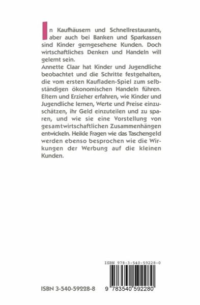 In Kaufhäusern und Schnellrestaurants, aber auch bei Banken und Sparkassen sind Kinder gern gesehene Kunden. Mit ihrem Taschengeld verfügen sie bereits über eigene Einkünfte, die sie nach ihren eigenen Vorstellungen ausgeben können. Annette Claar erzählt, wie viele Entdeckungen auf dem Weg zum selbständigen ökonomischen Handeln zu machen sind, wie viele Erklärungen gesucht werden müssen, z.B.: Warum ist ein Pullover teurer als eine Flasche Sprudel? Warum bringt man sein Geld zur Bank? Danach untersucht die Autorin die eigenen Geldquellen der Kinder: Wieviel Taschengeld bekommen sie? Was ist vom Jobben zu halten? Das Verhalten von Kindern als Konsumenten und der Einfluß von Werbung, Erziehung und Freunden werden kritisch beleuchtet. Schließlich wird gefragt, wie Kinder lernen können, sich ihr Geld einzuteilen.