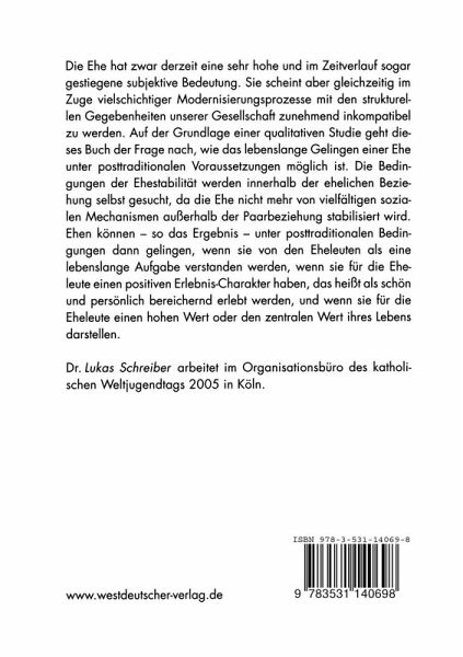 Die Ehe hat zwar derzeit eine sehr hohe und im Zeitverlauf sogar gestiegene subjektive Bedeutung. Sie scheint aber gleichzeitig im Zuge vielschichtiger Modernisierungsprozesse mit den strukturellen Gegebenheiten unserer Gesellschaft zunehmend inkompatibel zu werden. Auf der Grundlage einer qualitativen Studie geht dieses Buch der Frage nach, wie das lebenslange Gelingen einer Ehe unter posttraditionalen Voraussetzungen möglich ist. Die Bedingungen der Ehestabilität werden innerhalb der ehelichen Beziehung selbst gesucht, da die Ehe nicht mehr von vielfältigen sozialen Mechanismen außerhalb der Paarbeziehung stabilisiert wird. Ehen können - so das Ergebnis - unter posttraditionalen Bedingungen dann gelingen, wenn sie von den Eheleuten als eine lebenslange Aufgabe verstanden werden, wenn sie für die Eheleute einen positiven Erlebnis-Charakter haben, das heißt als schön und persönlich bereichernd erlebt werden, und wenn sie für die Eheleute einen hohen Wert oder den zentralen Wert ihres Lebens darstellen.