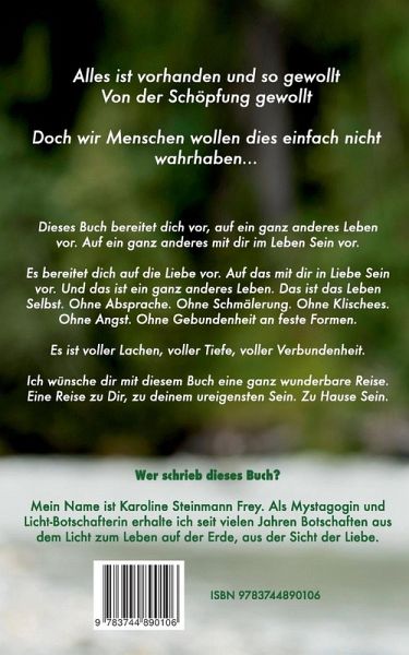 Alles ist vorhanden und so gewollt.Von der Schöpfung gewollt.Doch wir Menschen wollen dies einfach nicht wahrhaben ...Dieses Buch bereitet dich vor, auf ein ganz anderes Leben vor. Auf ein ganz anderes mit dir im Leben sein vor.Es bereitet dich auf die Liebe vor. Auf das mit dir in Liebe Sein vor. Und das ist ein ganz anderes Leben. Das ist das Leben selbst. Ohne Absprache. Ohne Schmälerung. Ohne Klischees. Ohne Angst. Ohne Gebundenheit an feste Formen.Es ist voller Lachen, voller Tiefe, voller Verbundenheit.Ich wünsche dir mit diesem Buch eine ganz wunderbare Reise. Eine Reise zu Dir, zu Deinem ureigensten Sein. Zu Hause sein.
