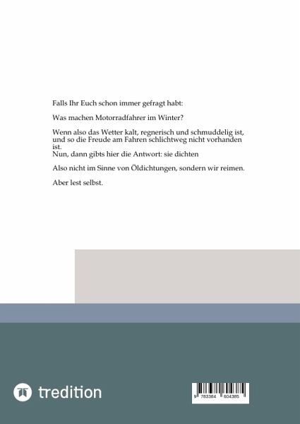 Falls Ihr Euch schon immer gefragt habt:Was machen Motorradfahrer im Winter?Wenn also das Wetter kalt, regnerisch und schmuddelig ist, und so die Freude am Fahren schlichtweg nicht vorhanden ist.Nun, dann gibts hier die Antwort: sie dichtenAlso nicht im Sinne von Öldichtungen, sondern wir reimen.