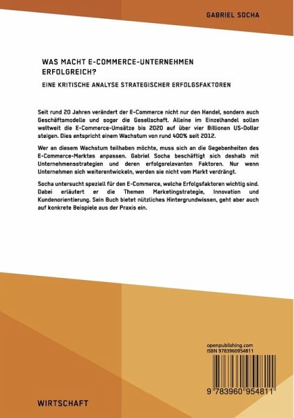 Seit rund 20 Jahren verändert der E-Commerce nicht nur den Handel, sondern auch Geschäftsmodelle und sogar die Gesellschaft. Alleine im Einzelhandel sollen weltweit die E-Commerce-Umsätze bis 2020 auf über vier Billionen US-Dollar steigen. Dies entspricht einem Wachstum von rund 400% seit 2012.Wer an diesem Wachstum teilhaben möchte, muss sich an die Gegebenheiten des E-Commerce-Marktes anpassen. Gabriel Socha beschäftigt sich deshalb mit Unternehmensstrategien und deren erfolgsrelevanten Faktoren. Nur wenn Unternehmen sich weiterentwickeln, werden sie nicht vom Markt verdrängt.Socha untersucht speziell für den E-Commerce, welche Erfolgsfaktoren wichtig sind. Dabei erläutert er die Themen Marketingstrategie, Innovation und Kundenorientierung. Sein Buch bietet nützliches Hintergrundwissen, geht aber auch auf konkrete Beispiele aus der Praxis ein.Aus dem Inhalt:- Unternehmensführung;- Management;- Amazon;- Whole Foods Market;- Kundenorientierung;- Lebensmittelmarkt