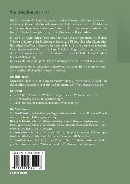 Dieses Buch entwickelt die relevanten Facetten von Wertschätzung und zeigt die Verbindung zu Wertschöpfung in Zeiten von Industrie 4.0, der Digitalisierung und des Klimawandels auf. Dabei wird deutlich, dass Wertschätzung sowohl für den Einzelnen, als auch für das Miteinander einen besonderen Stellenwert hat. Wertschätzung sorgt für Selbstbewusstsein, Selbstwirksamkeit und bildet die Grundlage für adäquate Kommunikation auf Augenhöhe. Auf organisationaler Ebene bewirkt Wertschätzung eine Verminderung von Komplexität und ermöglicht angstfreie Räume ohne Repressalien. Das Buch zeigt neue Formen der Wertschöpfung, in denen Risiken und Fehler frühzeitig erkannt werden und der Auftrag der Organisation im Zentrum kollektiver Aktivitäten steht. Darüber hinaus bietet Wertschätzen praktische Anregungen sowohl zur individuellen als auch organisationalen Weiterentwicklung.