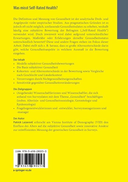 Die Definition und Messung von Gesundheit ist der analytische Dreh- und Angelpunkt vieler empirischer Studien. Aus pragmatischen Gründen ist es jedoch oft nicht möglich, umfassende Gesundheitsdaten zu erheben, weshalb häufig eine subjektive Bewertung der Befragten ("Self-Rated Health") verwendet wird. Doch inwieweit wird dabei aufgrund unterschiedlicher Erwartungen, Maßstäbe oder Erfahrungen derselbe Gesundheitsstatus unterschiedlich bewertet? Diese und andere Fragen stehen im Fokus dieser Arbeit. Dabei stellt sich z. B. heraus, dass es große Altersunterschiede darin gibt, welche Gesundheitsaspekte in welchem Ausmaß in die Bewertung eingehen.