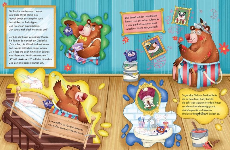 Das allererste Buch, das ich von Jan Kaiser rezensiert habe, fand ich so mittelgut.... (keine Angst, das weiß er auch). Inzwischen gehört er zu meinen liebsten Kinderbuchautoren. Warum? Ich mag seine immer flüssigen und dabei extrem kreativen Reime einfach unglaublich gern. Sie sind so voller Kreativität und trotzdem versteht man noch, worum es geht. Und Baldur Bär ist unser aktueller Liebling aus der Feder vom Autor. Er ist der Innbegriff eines durchritualisierten Bären. Anhand einiger Beispiele wird uns das klar gemacht. Auch wenn diese Beispiele nicht mit dem kindlichen Alltag übereinstimmen, so erinnert mich sein Leben doch stark an das von Kindern. Und klar, da muss viel in Routinen ablaufen. Aber die Gefahr, die dabei entsteht ist doch, dass die Kreativität und der Ideenreichtum untergeht, wenn man immerzu angepasst ist und sich an die Regeln hält. Baldurs neuer Freund, das/der/die Dideldum, hält sich an nullkomma gar nix. Zugegeben, ich habe kurz die Luft angehalten, als die beiden irgendwann voller Begeisterung die Wand angemalt haben. Aber auch schallend gelacht, als das Portrait der gruseligen Tante kopfüber im Gästeklo platziert wurde. Und macht euch nichts vor: auch ohne dieses Buch werden eure Kinder auf die Idee kommen, die Wände zu verschönern, hoffentlich. Und falls nicht, kauft oder leiht ihnen dieses Buch.