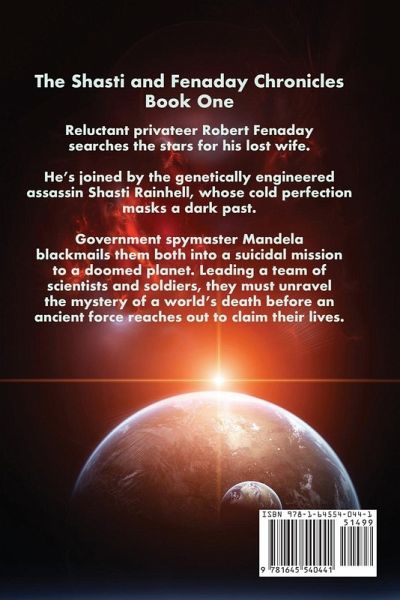 Reluctant privateer Robert Fenaday searches the stars for his lost wife. He’s joined by the genetically engineered assassin Shasti Rainhell, whose cold perfection masks a dark past. Government spymaster Mandela blackmails them both into a suicidal mission to a doomed planet. Leading a team of scientists and soldiers, they must unravel the mystery of a world’s death before an ancient force reaches out to claim their lives.