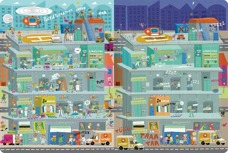 Am Tag herrscht reges Treiben - in der Stadt wuseln die Menschen durcheinander, im Krankenhaus wird operiert und am Hafen gearbeitet. Nun wird es Abend und die Nacht bricht an. Ganz still und ruhig wird es - oder etwa nicht? Denn auch nachts passiert ganz viel! Doch was ist anders?