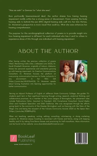"Was sie sieht" is German for "what she sees". Born profoundly bisensorineural deaf, the author shares how having hearing impairment instills within her a strong sense of discernment. From wearing the body hearing aids to behind-the-ear (BTE) digital hearing aids well into her late thirties, Dr. Moreman's perspective is more visual than auditory. What she sees enhances her hearing comprehension. The purpose for this autobiographical collection of poems is to provide insight into how hearing impairment is different for each individual who has it and for others to experience slices of life through one individual with hearing impairment.