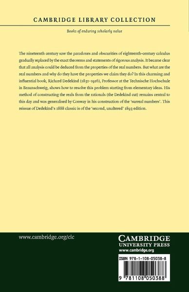 The nineteenth century saw the paradoxes and obscurities of eighteenth-century calculus gradually replaced by the exact theorems and statements of rigorous analysis. It became clear that all analysis could be deduced from the properties of the real numbers. But what are the real numbers and why do they have the properties we claim they do? In this charming and influential book, Richard Dedekind (1831-1916), Professor at the Technische Hochschule in Braunschweig, showed how to resolve this problem starting from elementary ideas. His method of constructing the reals from the rationals (the Dedekind cut) remains central to this day and was generalised by Conway in his construction of the 'surreal numbers'. This reissue of Dedekind's 1888 classic is of the 'second, unaltered' 1893 edition.