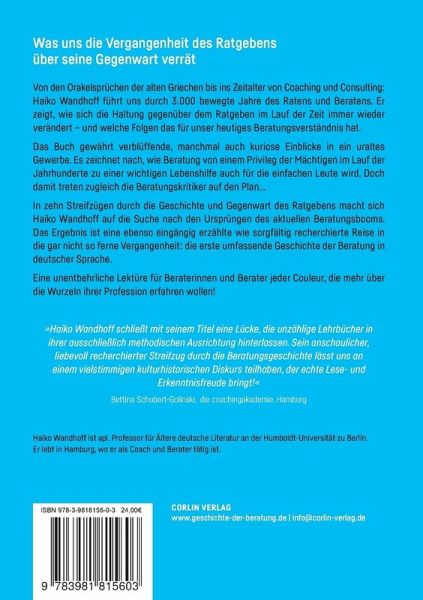 Von den Orakelsprüchen der alten Griechen bis ins Zeitalter von Coaching und Consulting: Haiko Wandhoff führt uns durch 3.000 bewegte Jahre des Ratens und Beratens. Er zeigt, wie sich die Haltung gegenüber dem Ratgeben im Lauf der Zeit immer wieder verändert ¿ und welche Folgen das für unser heutiges Beratungsverständnis hat. Das Buch gewährt verblüffende, manchmal auch kuriose Einblicke in ein uraltes Gewerbe. Es zeichnet nach, wie Beratung von einem Privileg der Mächtigen im Lauf der Jahrhunderte zu einer wichtigen Lebenshilfe, auch für die einfachen Leute, wird. Doch damit treten zugleich die Beratungskritiker auf den Plan¿ In zehn Streifzügen durch die Geschichte und Gegenwart des Ratgebens macht sich Haiko Wandhoff auf die Suche nach den Ursprüngen unseres aktuellen Beratungsbooms. Das Ergebnis ist eine ebenso eingängig erzählte wie sorgfältig recherchierte Reise in die gar nicht so ferne Vergangenheit: die erste umfassende Geschichte der Beratung in deutscher Sprache. Eine unentbehrliche Lektüre für Beraterinnen und Berater jeder Couleur, die mehr über die Wurzeln ihrer Profession erfahren wollen!