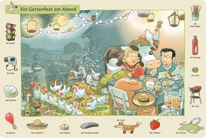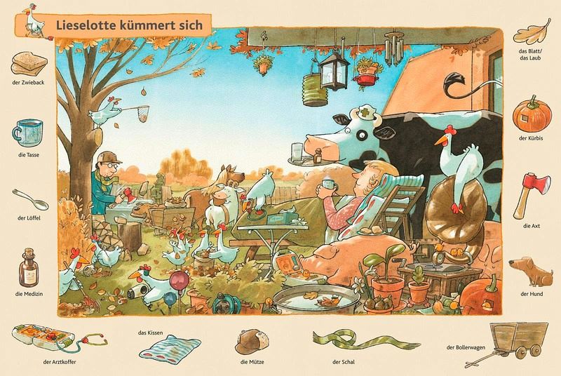 Auf sieben bunten Wimmelseiten kann man über 90 witzige Dinge entdecken und die Kuh Lieselotte auf ihren Streifzügen über den Bauernhof begleiten.