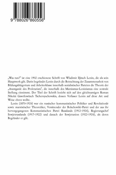 "Was tun?" ist eine 1902 erschienene Schrift von Wladimir Iljitsch Lenin, die als sein Hauptwerk gilt. Darin begründet Lenin durch die Betrachtung der Zusammenarbeit von Bildungsbürgertum und Arbeiterklasse innerhalb sozialistischer Parteien die Theorie der "Avantgarde des Proletariats", die innerhalb des Marxismus-Leninismus eine zentrale Stellung einnimmt. Der Titel der Schrift bezieht sich auf den gleichnamigen Roman Nikolai Gawrilowitsch Tschernyschewskis, dessen Verfasser Lenin auf diese Art und Weise ehren wollte. Lenin (1870-1924) war ein russischer kommunistischer Politiker und Revolutionär sowie marxistischer Theoretiker, Vorsitzender der Bolschewiki-Partei und der aus ihr hervorgegangenen Kommunistischen Partei Russlands (1912-1924), Regierungschef Sowjetrusslands (1917-1922) und danach der Sowjetunion (1922-1924), als deren Begründer er gilt.