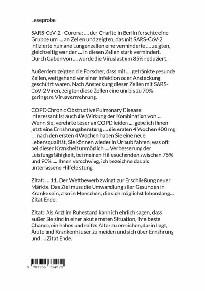 Leseprobe SARS-CoV-2 - Corona: .... der Charite in Berlin forschte eine Gruppe um .... an Zellen und zeigten, das mit SARS-CoV-2 infizierte humane Lungenzellen eine verminderte .... zeigten, gleichzeitig war der .... in diesen Zellen stark vermindert. Durch Gaben von .... wurde die Viruslast um 85% reduziert.Außerdem zeigten die Forscher, dass mit .... getränkte gesunde Zellen, weitgehend vor einer Infektion oder Ansteckung geschützt waren. Nach Ansteckung dieser Zellen mit SARS-CoV-2 Viren, zeigten diese Zellen eine um bis zu 70% geringere Virusvermehrung.COPD Chronic Obstructive Pulmonary Disease: interessant ist auch die Wirkung der Kombination von .... Wenn Sie, verehrte Leser an COPD leiden .... gebe ich Ihnen jetzt eine Ernährungsberatung .... die ersten 4 Wochen 400 mg .... nach den ersten 4 Wochen haben Sie eine neue Lebensqualität, Sie können wieder in Urlaub fahren, was oft bei dieser Krankheit oft unmöglich .... Verbesserung der Leistungsfähigkeit, bei meinen Hilfesuchenden zwischen 75% und 90% .... Ihnen verschwieg, ich bezeichne das als unterlassene HilfeleistungZitat: .... 11. Der Wettbewerb zwingt zur Erschließung neuer Märkte. Das Ziel muss die Umwandlung aller Gesunden in Kranke sein, also in Menschen, die sich möglichst lebenslang.... Zitat Ende. Zitat: Als Arzt im Ruhestand kann ich ehrlich sagen, dass außer Sie sind in einer akut ernsten Situation, ihre beste Chance, ein hohes und reifes Alter zu erreichen, darin liegt, Ärzte und Krankenhäuser zu meiden und sich über Ernährung und .... Zitat Ende.