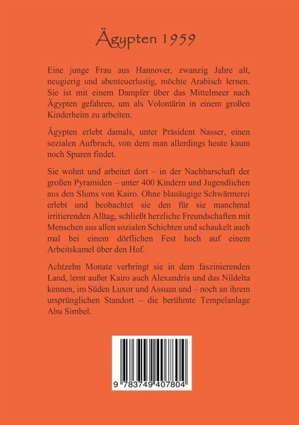 Ägypten 1959.Eine junge Frau aus Hannover, zwanzig Jahre alt, neugierig und abenteuerlustig, möchte Arabisch lernen. Sie ist mit einem Dampfer über das Mittelmeer nach Ägypten gefahren, um als Volontärin in einem großen Kinderheim zu arbeiten.Ägypten erlebt damals, unter Präsident Nasser, einen sozialen Aufbruch, von dem man allerdings heute kaum noch Spuren findet.Sie wohnt und arbeitet dort - in der Nachbarschaft der großen Pyramiden - unter 400 Kindern und Jugendlichen aus den Slums von Kairo. Ohne blauäugige Schwärmerei erlebt und beobachtet sie den für sie manchmal irritierenden Alltag, schließt herzliche Freundschaften mit Menschen aus allen sozialen Schichten und schaukelt auch mal bei einem dörflichen Fest hoch auf einem Arbeitskamel über den Hof.Achtzehn Monate verbringt sie in dem faszinierenden Land, lernt außer Kairo auch Alexandria und das Nildelta kennen, im Süden Luxor und Assuan und - noch an ihrem ursprünglichen Standort - die berühmte Tempelanlage Abu Simbel.
