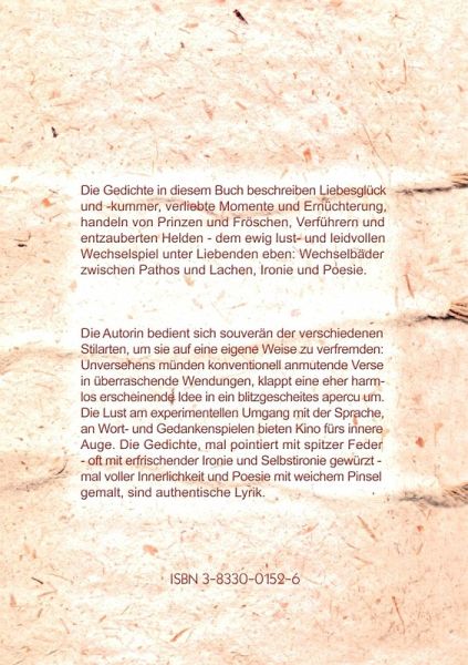 Die Gedichte in diesem Buch beschreiben Liebesglück und -kummer, verliebte Momente und Ernüchterung, handeln von Prinzen und Fröschen, Verführern und entzauberten Helden ¿ dem ewig lust- und leidvollen Wechselspiel unter Liebenden eben: Wechselbäder zwischen Pathos und Lachen, Ironie und Poesie. Die Autorin bedient sich souverän der verschiedenen Stilarten, um sie auf eine eigene Weise zu verfremden: Unversehens münden konventionell anmutende Verse in überraschende Wendungen, klappt eine eher harmlos erscheinende Idee in ein blitzgescheites Aperçu um. Die Lust am experimentellen Umgang mit der Sprache, an Vexierbildern, an Wort- und Gedankenspielen bieten Kino fürs innere Auge. Die Gedichte, mal pointiert mit spitzer Feder ¿ oft mit erfrischender Ironie und Selbstironie gewürzt ¿ mal voller Innerlichkeit und Poesie mit weichem Pinsel gemalt, sind authentische Lyrik.