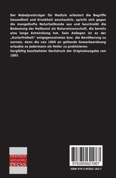 Der Nobelpreisträger für Medizin erläutert die Begriffe Gesundheit und Krankheit anschaulich, spricht sich gegen die mangelhafte Naturheilkunde aus und beschreibt die Bedeutung der Heilkunst als Naturwissenschaft, die bereits eine lange Entwicklung hat. Sein Anliegen ist es der ¿Kurierfreiheit¿ entgegenzutreten bzw. die Bevölkerung zu warnen, denn die von 1869 an geltende Gewerbeordnung erlaubte es jedermann als Heiler zu praktizieren. Sorgfältig bearbeiteter Nachdruck der Originalausgabe von 1885