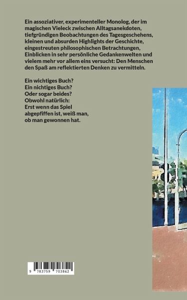 Ein assoziativer, experimenteller Monolog, der im magischen Vieleck zwischen Alltagsanekdoten, tiefgründigen Beobachtungen des Tagesgeschehens, kleinen und absurden Highlights der Geschichte, eingestreuten philosophischen Betrachtungen, Einblicken in sehr persönliche Gedankenwelten und vielem mehr vor allem eins versucht: Den Menschen den Spaß am reflektierten Denken zu vermitteln.Ein wichtiges Buch?Ein nichtiges Buch?Oder sogar beides?Obwohl natürlich: Erst wenn das Spiel abgepfiffen ist, weiß man, ob man gewonnen hat.
