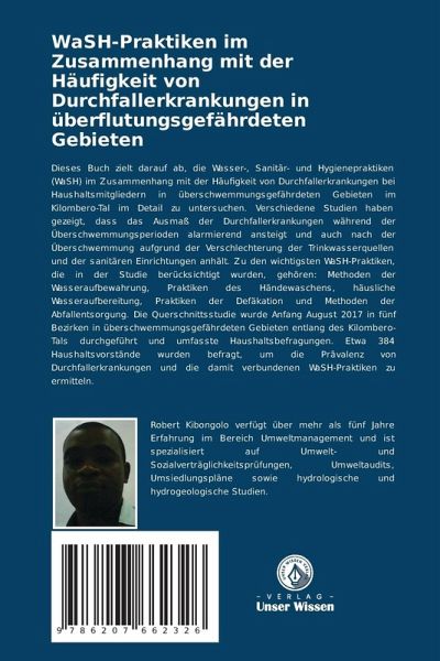 Dieses Buch zielt darauf ab, die Wasser-, Sanitär- und Hygienepraktiken (WaSH) im Zusammenhang mit der Häufigkeit von Durchfallerkrankungen bei Haushaltsmitgliedern in überschwemmungsgefährdeten Gebieten im Kilombero-Tal im Detail zu untersuchen. Verschiedene Studien haben gezeigt, dass das Ausmaß der Durchfallerkrankungen während der Überschwemmungsperioden alarmierend ansteigt und auch nach der Überschwemmung aufgrund der Verschlechterung der Trinkwasserquellen und der sanitären Einrichtungen anhält. Zu den wichtigsten WaSH-Praktiken, die in der Studie berücksichtigt wurden, gehören: Methoden der Wasseraufbewahrung, Praktiken des Händewaschens, häusliche Wasseraufbereitung, Praktiken der Defäkation und Methoden der Abfallentsorgung. Die Querschnittsstudie wurde Anfang August 2017 in fünf Bezirken in überschwemmungsgefährdeten Gebieten entlang des Kilombero-Tals durchgeführt und umfasste Haushaltsbefragungen. Etwa 384 Haushaltsvorstände wurden befragt, um die Prävalenz von Durchfallerkrankungen und die damit verbundenen WaSH-Praktiken zu ermitteln.