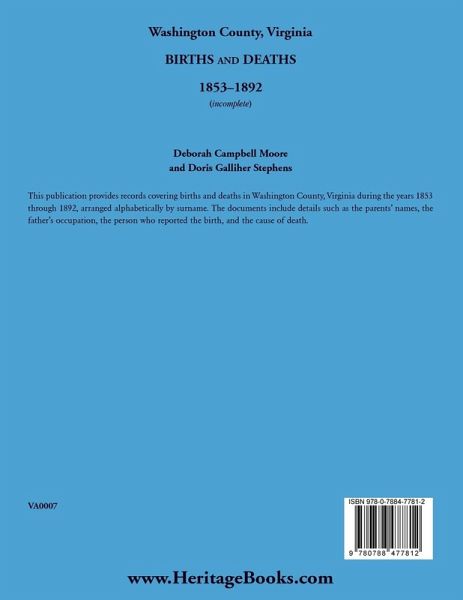 This publication provides records covering births and deaths in Washington County, Virginia during the years 1853 through 1892, arranged alphabetically by surname. The documents include details such as the parents' names, the father's occupation, the person who reported the birth, and the cause of death.