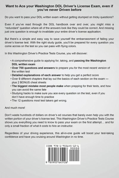 Want to Ace your Washington DOL Driver's License Exam, even if you've never Driven before? Are you afraid of failing your driver's license test? Or have you failed the test before and still aren't sure what the right answers are? Do you want to pass your DOL written exam without getting stumped on tricky questions? You might've heard that the driver's license test in Washington is immensely difficult, regardless of your driving experience. Plenty of out-of-staters will tell you horror stories of how they failed terribly on the written exam... despite years of driving under their belts. And it's even scarier if you've never been behind the wheel. Because as excited as you may be to start driving on your own... you only get a few tries to pass the written test... before you're forced to begin the whole application process all over again. Even if you've read through the DOL handbook over and over, you might miss a "redundant" question where all of the answers look like they could be correct. And missing just one question is enough to invalidate your entire driver's license application. But there's a simple and easy way to save yourself the embarrassment of failing your driver's license test. With the right study guide, you'll be prepared for every question you come across on the test so you can pass with flying colors. In this Washington Driver's Practice Tests Course, you will discover: * A comprehensive guide to applying for, taking, and passing the Washington DOL written exam * Over 700 questions and answers to prepare you for the most recent version of the written test * Detailed explanations of each answer to help you get a perfect score * Over 9 different chapters that lay out the basics of each section on the exam - plus 2 BONUS cheat sheets * The biggest mistake most people make when prepping for their tests, and how you can avoid the same fate * 56 tips and tricks to get you ready for both the written exam and the road test * Studying hacks to make sure you ace every question on the test, even if you don't have enough time to practice * The 12 questions most test takers get wrong - answer these the right way if you don't want to fail And much more! Don't waste hundreds or even thousands of dollars on driver's ed courses that barely even help you with the written portion of your driver's license test. This Washington Driver's Practice Tests Course shows you everything you need to know to pass your exam on the first attempt... and for only a small fraction of what it costs to hire an instructor. Regardless of your driving experience, this all-in-one guide will boost your test-taking confidence and have you cruising around Washington in no time. You could keep sitting at home worrying about whether or not you're going to have to retake the test... or you can master all the essential road rules, skills, and practices and get one step closer to obtaining your driver's license. If you want to Pass your DOL written exam once and for all, then scroll up an