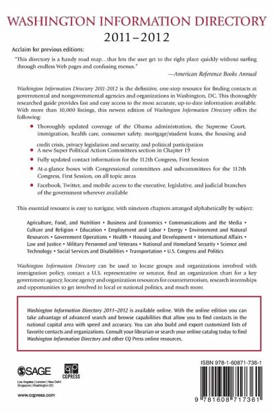 Washington Information Directory is the essential one-stop source for information on U.S. governmental and nongovernmental agencies and organizations. WID provides capsule descriptions that help users quickly and easily find the right person at the right organization. With more than 10,000 listings, the 2011- 2012 edition of WID features: • Thoroughly researched coverage of the Obama administration, the Supreme Court, immigration, health care, consumer safety, mortgage/student loans, the housing and credit crises, privacy and security, and political participation • Information on groups involved with war and conflict issues, including lobbying groups active in international affairs and antiwar movements • Fully updated contact information for the 111th Congress, Second Session • At-a-glance boxes with Congressional committee and subcommittee information • Information on new agencies and posts PLEASE CONFIRM ALL OF THIS WID also features up-to-date contact information for the high-level advisory positions or "czar" appointed by President Obama that oversee: • The auto industry • Green energy • Health-care • Technology • Stimulus accountability WID provides contact information for: • Congress and federal agencies • Nongovernmental organizations • Policy groups, foundations, and institutions • Governors and other state officials • U.S. ambassadors and foreign diplomats Key Features • Contact information for Congress, federal agencies, international, national, and local organizations and offices • Reference boxes and organization charts augmenting the text • Three easy ways to find information: name, organization, and subject indexes