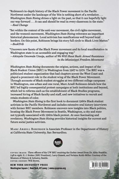 Documents the origins, actions, and impacts of the Black Student Union in the state of Washington during the tumultuous late 1960s. Washington State Rising documents the origins, actions, and impact of the Black Student Union (BSU) in Washington from 1967 to 1970. The BSU was a politicized student organization that had chapters across the West Coast and played a prominent role in the student wing of the Black Power Movement. Through accounts of Black student struggles at two different college campuses in Washington, one urban and one rural, Marc Arsell Robinson details how the BSU led highly consequential protest campaigns at both institutions and beyond, which led to reforms such as the establishment of Black Studies programs, increased hiring of Black faculty and staff, and new initiatives to recruit and retain students of color. Washington State Rising is the first book to document 1960s Black student activism in the Pacific Northwest and includes extensive oral history interviews with former BSU members. Robinson uncovers new insights into Black politics, locating the Black Power Movement in Seattle, Washington, a city and state not typically associated with 1960s black protest. At once fascinating and revelatory, Washington State Rising provides historical insights for current and future social justice activism.