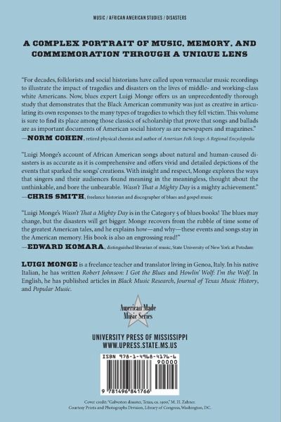 Wasn't That a Mighty Day: African American Blues and Gospel Songs on Disaster takes a comprehensive look at sacred and secular disaster songs, shining a spotlight on their historical and cultural importance. Featuring newly transcribed lyrics, the book offers sustained attention to how both Black and white communities responded to many of the tragic events that occurred before the mid-1950s. Through detailed textual analysis, Luigi Monge explores songs on natural disasters (hurricanes, floods, tornadoes, and earthquakes); accidental disasters (sinkings, fires, train wrecks, explosions, and air disasters); and infestations, epidemics, and diseases (the boll weevil, the jake leg, and influenza). Analyzed songs cover some of the most well-known disasters of the time period from the sinking of the Titanic and the 1930 drought to the Hindenburg accident, and more. Thirty previously unreleased African American disaster songs appear in this volume for the first time, revealing their pertinence to the relevant disasters. By comparing the song lyrics to critical moments in history, Monge is able to explore how deeply and directly these catastrophes affected Black communities; how African Americans in general, and blues and gospel singers in particular, faced and reacted to disaster; whether these collective tragedies prompted different reactions among white people and, if so, why; and more broadly, how the role of memory in recounting and commenting on historical and cultural facts shaped African American society from 1879 to 1955.