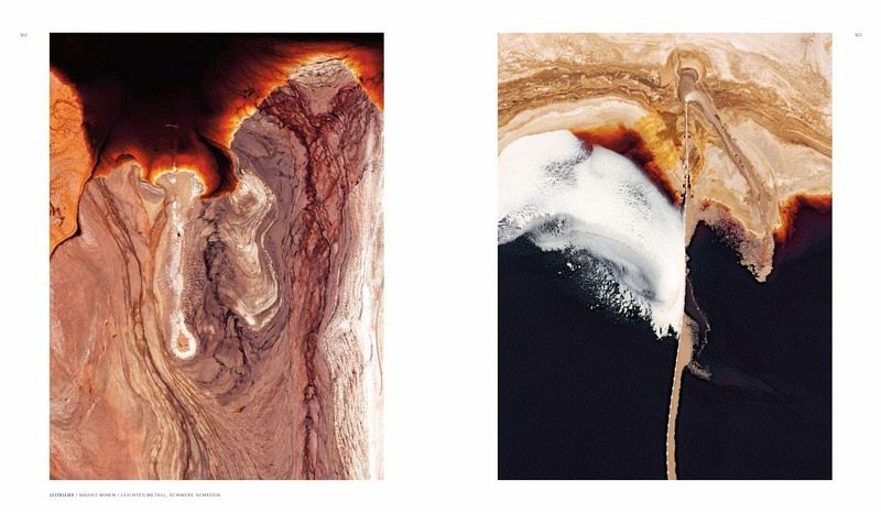 Diesem Trend folgt auch Kevin Krautgartner. Allerdings beschränkt er sich mit seinen famosen Bildern, die aus dem Hubschrauber oder Flugzeug geschossen wurden, auf ein Motiv, das er in all seiner Wandlungsfähigkeit zeigt: Wasser. Auf dem einen Foto wirkt es transparent, dann wieder blau oder schwarz. Hier glänzt es, als sei es verchromt, dort ähnelt es zähem Linseneintopf. Das Great Barrier Reef ist bei Krautgartner eine einzige Arabeske, ein spanisches Salzabbaugebiet erinnert an Gemälde von Mark Rothko. Besonders eindrucksvoll sind Bauxit-Minen, bei denen pro Tonne Aluminium rund anderthalb Tonnen Rotschlamm anfallen. Der wiederum ist giftig, sieht aber sensationell aus, mal wie kalter Kaffee, mal wie Muskelgewebe. Dagegen mutet ein Tulpenfeld in den Niederlanden recht ordentlich an: Wie mit dem Lineal gezogene Linien werden vom Regenbogenstrahl einer Sprinkleranlage zur kompositorischen Vollendung gebracht.
