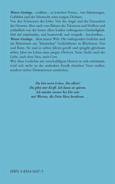 Wasser-Gesänge... erzählen... in lyrischen Versen... von Stimmungen, Gefühlen und der Sehnsucht eines jungen Dichters: Von den Schmerzen der Liebe. Von der Angst und der Einsamkeit des Herzens. Aber auch vom Balsam des Träumens und Hoffens und schließlich von der hinter allem Leiden verborgenen Glückseligkeit. Mal tief empfunden, mal humorvoll, mal verspielt... beschreiben... Wasser-Gesänge... diese innere Welt. Die vorliegenden Gedichte sind ein Bekenntnis zur "klassischen" Gedichtform: zu Rhythmus, Vers und Reim. Sie sind in sieben Jahren gereift und spiegeln gleichsam sieben Jahre im Leben eines jungen Dichters. Seine Suche nach der Liebe, nach dem Sinn, nach Gott. Wer diese Gedichte mit unschuldigem Herzen in sich aufnimmt, wird sich nicht an der arabesken Erotik einzelner Verse stoßen, sondern tiefere Dimensionen entdecken.