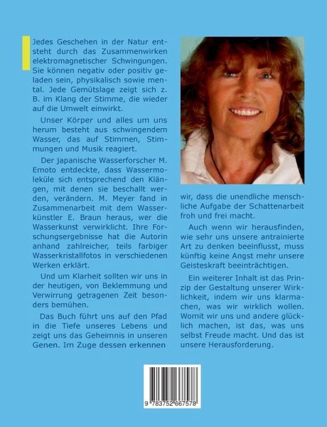 Unser Körper und alles um uns herum besteht aus schwingendem Wasser, das auf Stimmen, Stimmungen und Musik reagiert.Der japanische Wasserforscher M. Emoto entdeckte, dass Wassermoleküle sich entsprechend den Klängen, mit denen sie beschallt werden, verändern. M. Meyer fand in Zusammenarbeit mit dem Wasserkünstler E. Braun heraus, wer die Wasserkunst verwirklicht. Ihre Forschungsergebnisse hat die Autorin anhand zahlreicher, teils farbiger Wasserkristallfotos in verschiedenen Werken erklärt. Und um Klarheit sollten wir uns in der heutigen, von Beklemmung und Verwirrung getragenen Zeit besonders bemühen.Das Buch führt uns auf den Pfad in die Tiefe unseres Lebens und zeigt uns das Geheimnis in unseren Genen. Im Zuge dessen erkennen wir, dass die unendliche menschliche Aufgabe der Schattenarbeit froh und frei macht. Auch wenn wir herausfinden, wie sehr uns unsere antrainierte Art zu denken beeinflusst, muss künftig keine Angst mehr unsere Geisteskraft beeinträchtigen.Ein weiterer Inhalt ist das Prinzip der Gestaltung unserer Wirklichkeit, indem wir uns klarmachen, was wir wirklich wollen. Womit wir uns und andere glücklich machen, ist das, was uns selbst Freude macht. Und das ist unsere Herausforderung.