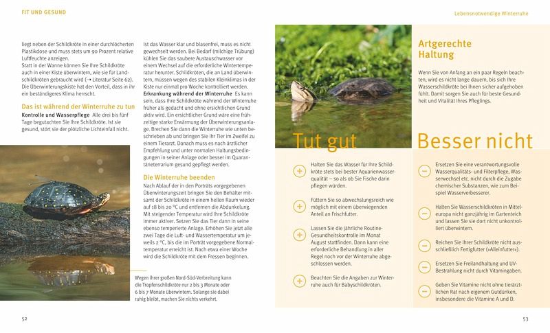 Wasserschildkröten faszinieren, sind sie doch Zeugen aus vergangenen Zeiten. Denn ihre Vorfahren hatten bereits vor rund 250 Millionen Jahren begonnen, die Erde zu erobern. Auch wegen ihres außergewöhnlichen Äußeren haben sie eine große Fangemeinde. Der Schildkröten-Experte Dr. Hartmut Wilke erläutert im GU Tierratgeber Wasserschildkröten alles Wichtige rund um die Haltung von Wasserschildkröten - von der Auswahl und Eingewöhnung über die Pflege, Ernährung und Gesundheit bis hin zur richtigen Überwinterung. In ausführlichen Porträts werden die beliebtesten Wasserschildkröten-Arten vorgestellt. Zudem gibt es viele praktische Tipps und Ideen für die artgerechte Gestaltung eines Aquariums oder Aquaterrariums sowie einer Freiland- oder Balkonanlage. Der Verhaltensdolmetscher erklärt darüber hinaus typische Verhaltensweisen der Wasserschildkröten. Und mit SOS - was tun? ist Hilfe im Notfall garantiert.