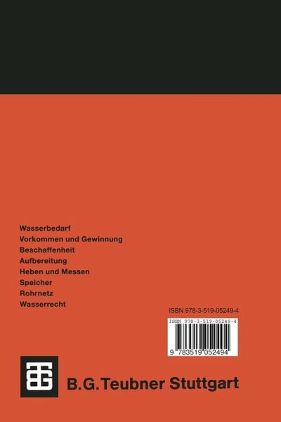 1 Grundlagen einer Wasserversorgung.- 1.1 Bestandteile und Begriffe der Wasserversorgung.- 1.2 Anforderungen an eine Wasserversorgung.- 2 Wasserbedarf.- 2.1 Eigenbedarf und Wasserverluste.- 2.2 Verbrauchswerte.- 2.3 Schwankungen des Wasserverbrauchs.- 2.4 Feuerlöschwasser.- 2.5 Wassereinsparung.- 2.6 Steigerung des Trinkwasserverbrauchs.- 3 Wasservorkommen und Wassergewinnung.- 3.1 Niederschläge und Abflüsse.- 3.2 Grundwasser.- 3.3 Fassungsanlagen für die Grundwassergewinnung.- 3.4 Oberflächenwasser.- 4 Chemische, physikalische und biologische Beschaffenheit des Wassers.- 4.1 Grundlagen.- 4.2 Konzentrationsangaben in der Wasserchemie.- 4.3 Wichtige Begriffe der Wasseranalytik.- 4.4 Trinkwasserinhaltsstoffe.- 4.5 Physikalische, chemische und biochemische Grundlagen der Eisen- und Manganentfernung.- 4.6 Die Löslichkeit von Gasen im Wasser.- 5 Aufbereitungsverfahren in der Trinkwasserversorgung.- 5.1 Siebverfahren, Absetzbecken.- 5.2 Flockung und Fällung.- 5.3 Filtration.- 5.4 Belüftung und Entgasung.- 5.5 Entsäuerung.- 5.6 Eisen- und Manganentfernung.- 5.7 Kombinierte Entfernung von Wasserinhaltsstoffen.- 5.8 Desinfektion von Trinkwasser und Versorgungsanlagen.- 5.9 Spurenstoff- und Salzentfernung sowie Enthärtung.- 5.10 Ablaufplan für die Herstellung eines Wasserwerkes.- 6 Wasserförderung und Mengenmessung.- 6.1 Pumpen für die Trinkwasserversorgung.- 6.2 Pumpwerke.- 6.3 Druckerhöhungspumpen.- 6.4 Wassermengenmessung.- 7 Speichern des Wassers.- 7.1 Hochbehälter.- 7.2 Druckbehälter.- 7.3 Löschwasserspeicher.- 8 Verteilen des Wassers.- 8.1 Hydraulische Grundlagen.- 8.2 Rohrnetzarten und -berechnung.- 8.3 Baustoffe in der Wasserverteilung.- 8.4 Ausführung der Rohrleitung.- 8.5 Rohrnetzüberwachung und -betrieb.- 9 Wasserrecht.- 9.1 Rechtskompetenzen undRechtsformen.- 9.2 Wasserhaushaltsgesetz, landesrechtliche Umsetzung und Verwaltungshandeln.- 9.3 Weitere Rechtsquellen für die Wasserversorgung (Auswahl).- 9.4 Rechtsformen der WVU.- Literatur.- DVGW-Arbeitsblätter.- Regelwerk Wasser.- Regelwerk Gas/Wasser.- DIN-Verzeichnis.
