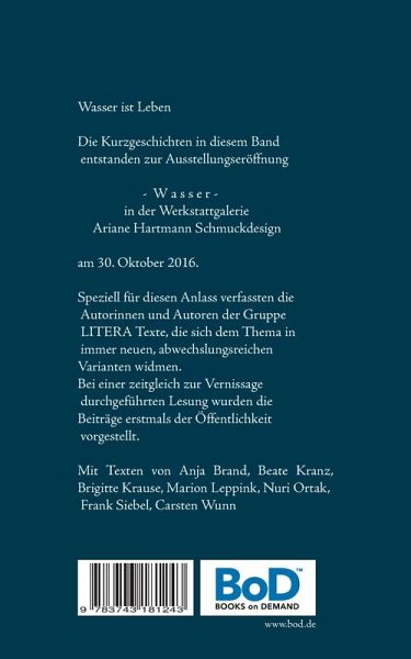 Wasser ist LebenDie Kurzgeschichten in diesem Band entstanden zur Ausstellungseröffnung - Wasser - in der Werkstattgalerie.Ariane Hartmann Schmuckdesign am 30. Oktober 2016.Speziell für diesen Anlass verfassten die Autorinnen und Autoren der Gruppe LITERA Texte, die sich dem Thema in immer neuen, abwechslungsreichen Varianten widmen.Bei einer zeitgleich zur Vernissage durchgeführten Lesung wurden die Beiträge erstmals der Öffentlichkeit vorgestellt. Mit Texten von Anja Brand, Beate Kranz, Brigitte Krause, Marion Leppink, Nuri Ortak, Frank Siebel, Carsten Wunn.Titelbild: Sonja Opfermann