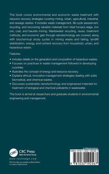 This book covers environmental and economic waste treatment with resource recovery strategies covering mining, urban, agricultural, industrial, and sewage wastes. It includes waste management, life-cycle assessment, recycling, and recovering valuable materials from blast furnace slags, iron ore, coal, and bauxite mining. Wastewater recycling, reuse, treatment methods, and economic gain through nanotechnology are covered, along with biochemical study cycles in mining waste and tailing, landfill stabilization, energy, and nutrient recovery from household, urban, and hazardous waste.