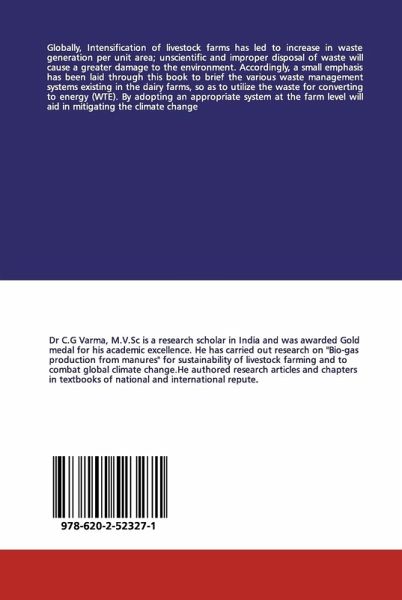 Globally, Intensification of livestock farms has led to increase in waste generation per unit area; unscientific and improper disposal of waste will cause a greater damage to the environment. Accordingly, a small emphasis has been laid through this book to brief the various waste management systems existing in the dairy farms, so as to utilize the waste for converting to energy (WTE). By adopting an appropriate system at the farm level will aid in mitigating the climate change