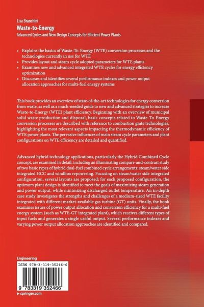 This book provides an overview of state-of-the-art technologies for energy conversion from waste, as well as a much-needed guide to new and advanced strategies to increase Waste-to-Energy (WTE) plant efficiency. Beginning with an overview of municipal solid waste production and disposal, basic concepts related to Waste-To-Energy conversion processes are described, highlighting the most relevant aspects impacting the thermodynamic efficiency of WTE power plants. The pervasive influences of main steam cycle parameters and plant configurations on WTE efficiency are detailed and quantified. Advanced hybrid technology applications, particularly the Hybrid Combined Cycle concept, are examined in detail, including an illuminating compare-and-contrast study of two basic types of hybrid dual-fuel combined cycle arrangements: steam/water side integrated HCC and windbox repowering.