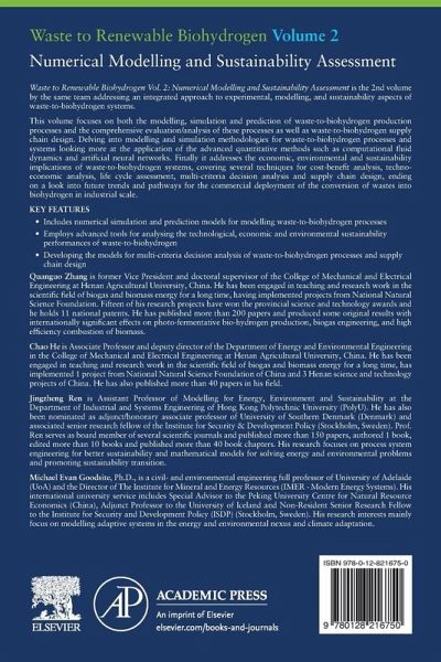 Waste to Renewable Biohydrogen, Volume Two: Numerical Modelling and Sustainability Assessment provides an integrated approach on the experimental, modeling and sustainability aspects of waste-to-biohydrogen systems. The book focuses on processes for waste treatment to hydrogen production, delving into modeling and simulation methodologies for the design and optimization of different processes and systems. In addition, it looks at the application of computational fluid dynamics and artificial neural networks. Finally, it addresses the economic, environmental and sustainability implications of waste-to-biohydrogen systems, covering several techniques for cost-benefit analysis, techno-economic analysis, lifecycle assessment, sustainability ranking and supply chain design.