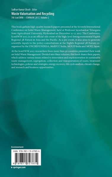 This book gathers high-quality research papers presented at the Seventh International Conference on Solid Waste Management, held at Professor Jayashankar Telangana State Agricultural University, Hyderabad on December 15-17, 2017. The Conference, IconSWM 2017, is as an official side event of the high-level Intergovernmental Eighth Regional 3R Forum in Asia and the Pacific. As a pre-event, it also aims to generate scientific inputs to the policy consultations at the Eighth Regional 3R Forum co-organised by the UNCRD/UNDESA, MoEFCC India, MOUD India and MOEJ, Japan.