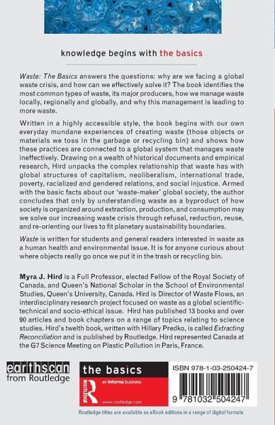 Written in a highly accessible style, the book begins with our own everyday mundane experiences of creating waste (those objects or materials we toss in the garbage or recycling bin) and shows how these practices are connected to a global system that manages waste ineffectively. Drawing on a wealth of historical documents and empirical research, Hird unpacks the complex relationship that waste has with global structures of capitalism, neoliberalism, international trade, poverty, racialized and gendered relations, and social injustice. Armed with the basic facts about our 'waste-maker' global society, the author concludes that only by understanding waste as a byproduct of how society is organized around extraction, production, and consumption may we solve our increasing waste crisis through refusal, reduction, reuse, and re-orienting our lives to fit planetary sustainability boundaries.