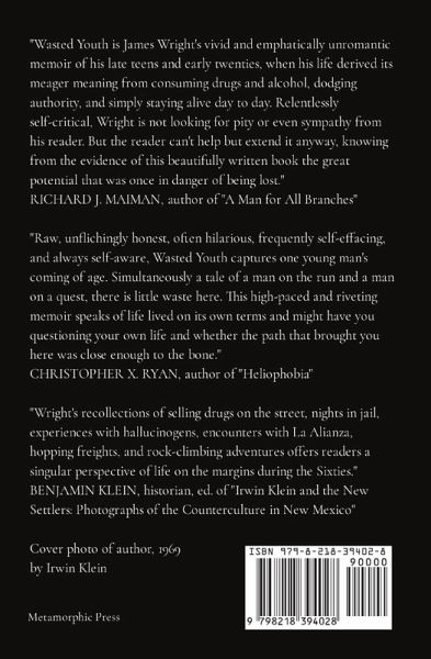 "Wasted Youth is James Wright's vivid and emphatically unromantic memoir of his late teens and early twenties, when his life derived its meager meaning from consuming drugs and alcohol, dodging authority, and simply staying alive day to day. Relentlessly self-critical, Wright is not looking for pity or even sympathy from his reader. But the reader can't help but extend it anyway, knowing from the evidence of this beautifully written book the great potential that was once in danger of being lost." Richard J. Maiman, author of A Man for all Branches Coming of age in the social turbulence of the late 60s presented a challenge for the young men of the time. If there was a legitimate rite of passage, the author didn't know about it, and if he did, he wouldn't have done it anyway, preferring to chart his own course into the underworld of change. Wasted Youth is his account of that passage, a tale of survival and slow learning. Told with humor and an eye for absurdity, the memoir follows the author down blind alleys and through close calls, wandering in the darkness of drugs and crime, looking for something he might not recognize if he found it. A personal journey of getting lost and never quite found, the author avoids triumph but discovers something far more meaningful: the path to a place where grief can be felt at the heart of being.