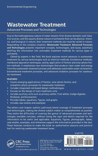 Due to the heterogeneous nature of water streams from diverse domestic and industrial sources, and the equally diverse nature of pollutants that can be physical, chemical, and biological in nature, their treatment methods also must be varied in nature. Responding to this complex situation, Wastewater Treatment: Advanced Processes and Technologies presents important concepts, technologies, and issues, essentially distilling the information into actionable treatment methods for various types of pollutants. Edited by experts in the field, the book explores recent advances in wastewater treatment by various technologies such as chemical methods, biochemical methods, membrane separation techniques, and by application of Fenton and solar photo Fenton methods. It emphasizes new technologies that produce clean water and energy from the wastewater treatment process and addresses sustainable water reclamation, biomembrane treatment processes and advanced oxidation processes for wastewater treatment. The editors and chapter authors judiciously blend coverage of treatment processes and technologies, making the diverse subject matter as comprehensible as possible. They tackle the difficulties of covering the gamut of advanced processes and technologies available concisely, without losing the rigor and details required for the information to be useful and applicable. Equations, figures, photographs, tables, case studies, examples, and references support the information provided in the text. These features combine to make the book an authoritative resource and practical tool for resolving wastewater treatment issues.