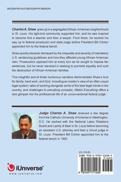 Charles A. Shaw grew up in a segregated African-American neighborhood in St. Louis. His tight-knit community supported him, and he was inspired to become first a teacher and then a lawyer. From there, he worked his way up to federal prosecutor and state judge before President Bill Clinton appointed him to the federal bench. Shaw quickly became dismayed by the inequality and severity of mandatory U.S. sentencing guidelines and how they affected young African-American men. Prosecutors opposed him at every turn as he sought to impose fair sentences, but he never wavered in seeking to promote equality and curb the destruction of African-American families. This insightful and at times humorous narrative demonstrates Shaw's love for family, hard work, and God. Including an insider's view of an often unjust legal system, tales of working alongside some of the best legal minds in the country, and challenges to prevailing concepts, Watch Everything offers a rare glimpse into the professional life of an unconventional federal judge.
