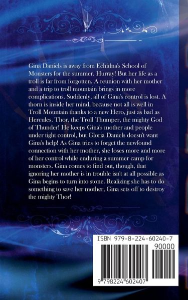 Gina Daniels is away from Echidna's School of Monsters for the summer. Hurray! But her life as a troll is far from forgotten. A reunion with her mother and a trip to troll mountain brings in more complications. Suddenly, all of Gina's control is lost. A thorn is inside her mind, because not all is well in Troll Mountain thanks to a new Hero, just as bad as Hercules. Thor, the Troll Thumper, the mighty God of Thunder! He keeps Gina's mother and people under tight control, but Gloria Daniels doesn't want Gina's help! As Gina tries to forget the newfound connection with her mother, she loses more and more of her control while enduring a summer camp for monsters. Gina comes to find out, though, that ignoring her mother is in trouble isn't at all possible as Gina begins to turn into stone. Realizing she has to do something to save her mother, Gina sets off to destroy the mighty Thor!