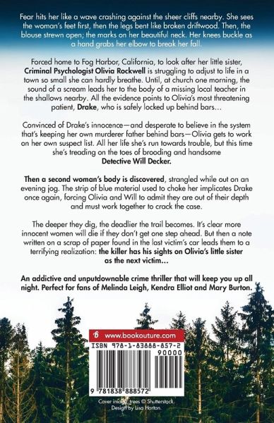 Fear hits her like a wave crashing against the sheer cliffs nearby. She sees the woman's feet first, then the legs bent like broken driftwood. Then, the blouse strewn open; the marks on her beautiful neck. Her knees buckle as a hand grabs her elbow to break her fall. Forced home to Fog Harbor, California, to look after her little sister, Criminal Psychologist Olivia Rockwell is struggling to adjust to life in a town so small she can hardly breathe. Until, at church one morning, the sound of a scream leads her to the body of a missing local teacher in the shallows nearby. All the evidence points to Olivia's most threatening patient, Drake, who is safely locked up behind bars… Convinced of Drake's innocence-and desperate to believe in the system that's keeping her own murderer father behind bars-Olivia gets to work on her own suspect list. All her life she's run towards trouble, but this time she's treading on the toes of brooding and handsome Detective Will Decker. Then a second woman's body is discovered, strangled while out on an evening jog. The strip of blue material used to choke her implicates Drake once again, forcing Olivia and Will to admit they are out of their depth and must work together to crack the case. The deeper they dig, the deadlier the trail becomes. It's clear more innocent women will die if they don't get one step ahead. But then a note written on a scrap of paper found in the last victim's car leads them to a terrifying realization: the killer has his sights on Olivia's little sister as the next victim… An addictive and unputdownable crime thriller that will keep you up all night. Perfect for fans of Melinda Leigh, Kendra Elliot and Mary Burton. Readers love Ellery Kane: 'Gripping, suspenseful, and downright dark. It held me captivated until I finished it. It's that good.' Book Nook Nuts, 5 stars 'Hits that spot that craved a good, creepy, twisty book that would hook me' Goodreads reviewer, 5 stars 'Lace up your running shoes kids, you're gonna need them to keep up with this fast-paced thriller!…a sprint from page one; leaving your huffing and puffing-utterly breathless in the end. I give this a much deserved 5 stars!' Goodreads reviewer, 5 stars 'Plenty of twists make this a riveting and unforgettable book. I absolutely loved this!… will have you on the edge-of-your-seat. Be prepared to be up all night.' Goodreads reviewer, 5 stars 'More twists and turns than any thrill ride. It was raw and gritty and had me holding my breath and on the edge of my seat. It was both riveting and consuming… This story shattered my mind and ripped my heart out.' Natalie Weston Bookclub Gone Wrong, 5 stars 'Wow, what a suspenseful and thrilling read this book turned out to be!… gripped you from the very first page… on an unforgettable ride!' Goodreads reviewer, 5 stars