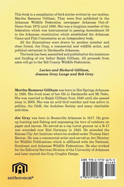 This book is a compilation of bird stories written by our mother, Martha Ramseur Gillham. They were first published in the Arkansas Wildlife Federation newspaper Arkansas Out-of-Doors from 1972 until 1985. She was a longtime member of the federation which was instrumental in passing Amendment 35 to the Arkansas constitution which established the Arkansas Game and Fish Commission as an independent body. All the illustrations were drawn by another member and close friend, Joe Gray, a commercial and wildlife artist, and political cartoonist in Dardanelle Arkansas. The book has been assembled and published at the insistence and funding of our father Ralph Gillham. All proceeds from sales will go to the Yell County Wildlife Federation. Lucien and Richard Gillham, Joanna Gray Lange and Bob Gray