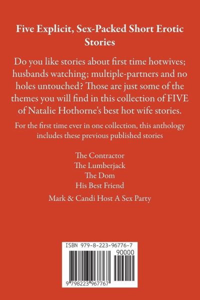 Do you like stories about, first time hotwives:; husbands watching; multiple-partners and no holes untouched? Those are just some of the themes you will find in this collection of FIVE of Natalie Hothorne's best hot wife stories. For the first time ever in one collection, this anthology includes these previous published stories The Contractor The Lumberjack The Dom His Best Friend Mark & Candi Host A Sex Party