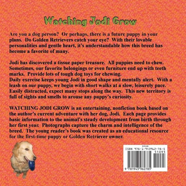 Are you a dog person? Or perhaps, there is a future puppy in your plans. Do Golden Retrievers catch your eye? With their lovable personalities and gentle heart, it's understandable how this breed has become a favorite of many. Jodi has discovered a tissue paper treasure. All puppies need to chew. Sometimes, our favorite belongings or even furniture end up with teeth marks. Provide lots of tough dog toys for chewing. Daily exercise keeps young Jodi in good shape and mentally alert .With a leash on our puppy, we begin with short walks at a slow, leisurely pace. Easily distracted, expect many stops along the way. This new territory is full of sights and smells to arouse any puppy's curiosity. WATCHING JODI GROW is an entertaining, nonfiction book based on the author's current adventure with her dog, Jodi. Each page provides basic information to the animal's steady development from birth through her first year. Photographs capture the charm and intelligence of the breed. The young reader's book was created as an educational resource for the first-time puppy or Golden Retriever owner.