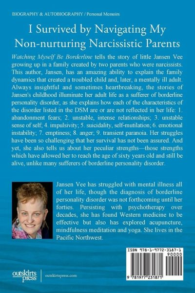 Watching Myself Be Borderline: A Smart Sufferer Says How It Started and How She Survives tells the story of how borderline personality disorder was induced in author Jansen Vee, how Vee has grown over forty-five years of psychotherapy, and how her strengths and gifts have allowed her to survive. Watching Myself Be Borderline is not an advice book. It's a rare first-person account and analysis by a sufferer of borderline personality disorder about her experience. Perfect for readers who themselves have borderline personality disorder or for therapists or for those whose loved ones working are sufferers, Vee's story shows that a person can be intelligent and successful and also mentally ill. Through her book, Vee hopes that other high-functioning people with mental illness will feel empowered to get appropriate help and recognize that mental illness does not equal brokenness.